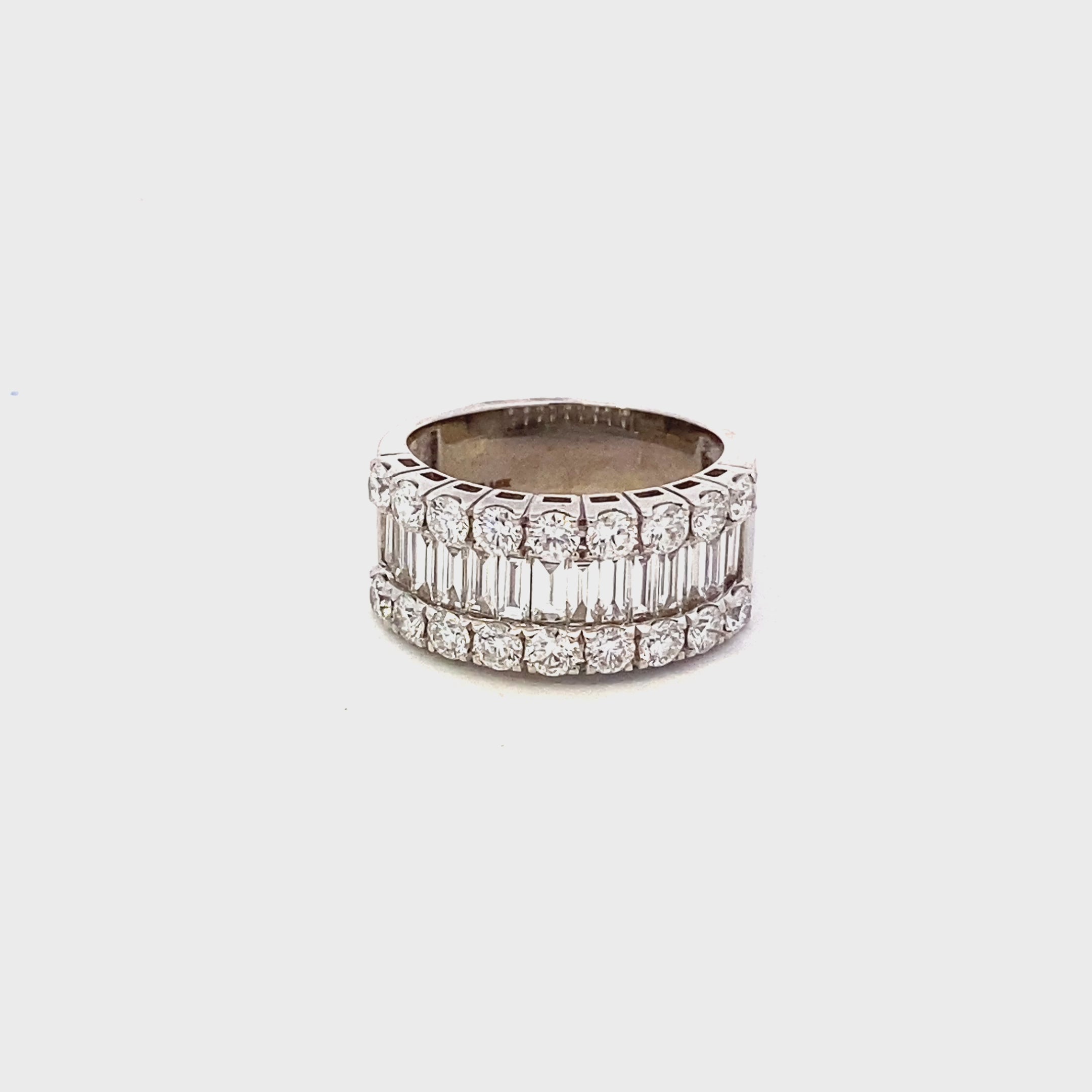 Experience the ultimate in luxury with this beautifully designed diamond ring. It features a center row of 14 meticulously placed straight baguette diamonds (tw=1.76ct.) that catch the light from every angle flanked by two rows of 9 round diamonds per row (tw=1.46ct). This piece is the epitome of craftsmanship and sophistication.
