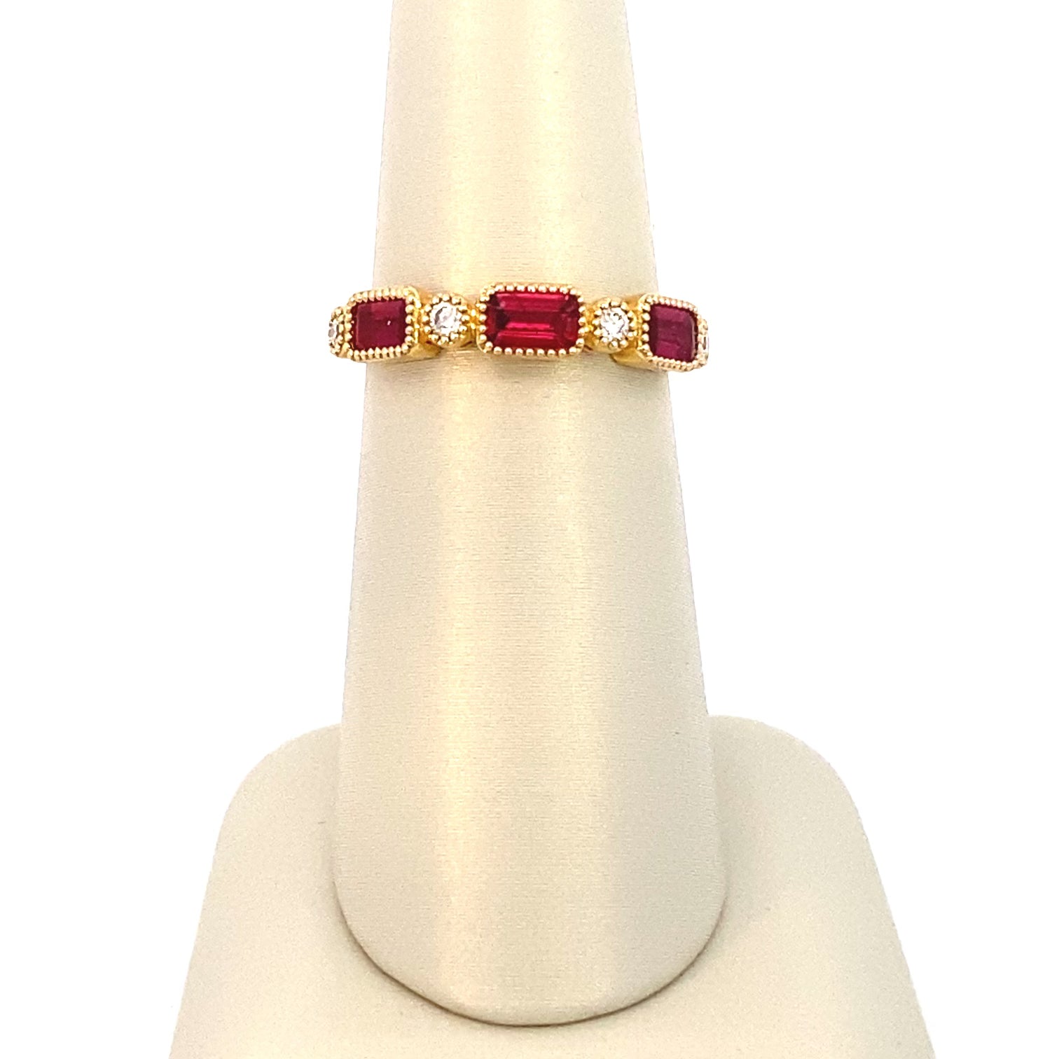 Alternating 3 emerald cut rubies=.90ct and 4 round diamonds=.13ct