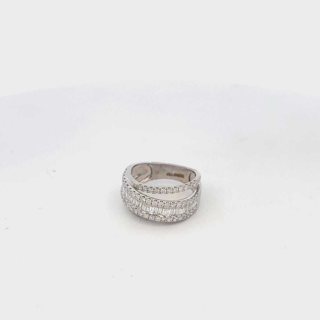 Enhance your style with a touch of luxury with our Ring diamond band round and baguette multi-rows 18kt white gold. The wide open band features 2 outer borders with sparkling round diamonds, while the center dazzles with a row of straight baguette diamonds surrounded by tiny round diamonds. Total weights: rounds= 1.05ct, baguettes= 0.73ct.